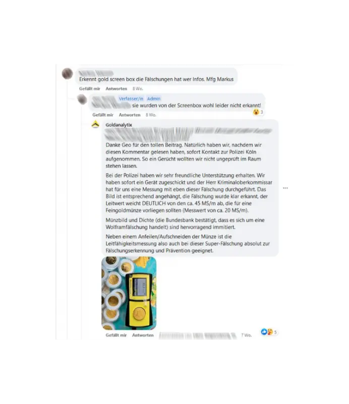 Todos estos aspectos hicieron que, incluso en uno de los mayores grupos de Facebook sobre «monedas de oro y falsificaciones de metales preciosos», los hechos se abordaran rápidamente y se debatieran intensamente. Se examinaron las imágenes oficiales de las falsificaciones y los artículos de prensa relacionados, y se intercambiaron las primeras opiniones. Muy pronto, las contribuciones se centraron en cómo protegerse mejor de estas falsificaciones.