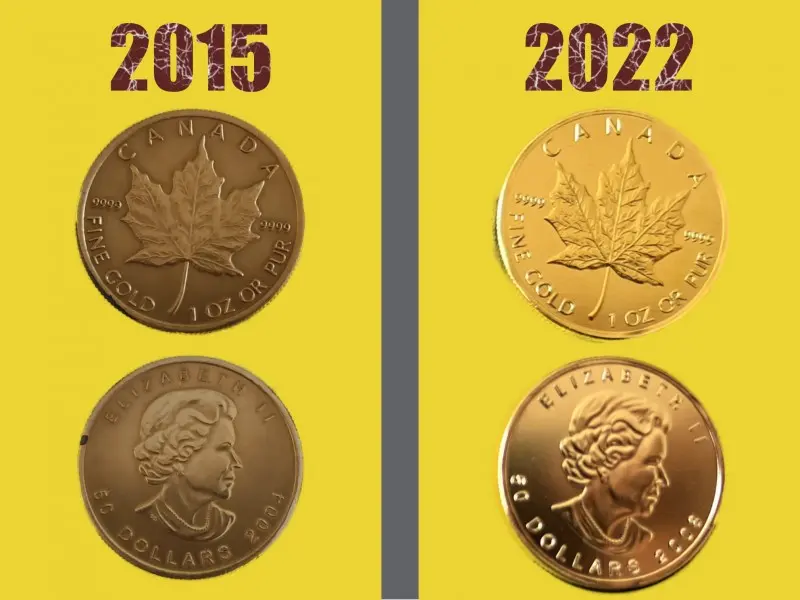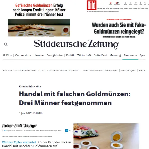 En junio de 2022, los principales medios de comunicación del país informaron de que tres delincuentes habían vendido en Colonia monedas de oro falsificadas de gran calidad (Maple Leafs de oro, 1 onza) y habían estafado a varias víctimas cantidades elevadas de euros (alrededor de 80 000 €). La policía cree que hay muchas más monedas falsificadas en circulación. En nuestra opinión, dada la «excelente» calidad de las falsificaciones, es motivo suficiente para informar más detalladamente sobre el caso. Las monedas tienen una calidad de acuñación sorprendentemente similar y su peso y dimensiones son perfectos. Es evidente que la imagen de la acuñación y la calidad de la imitación de los detalles más finos han mejorado considerablemente en los últimos años. Esto se aprecia claramente al comparar una Maple Leaf con núcleo de tungsteno del año 2015 y la variante que circula actualmente en Colonia (véase el banner deslizante más abajo).