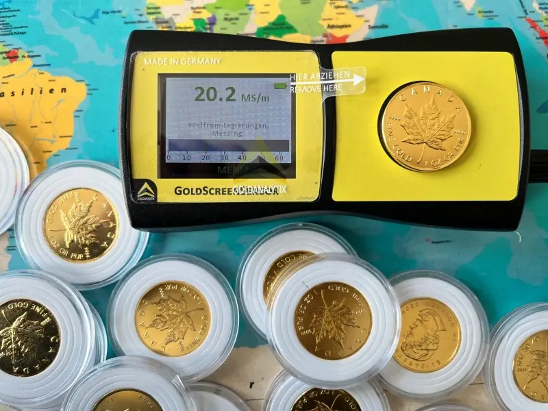 En Goldanalytix tuvimos claro que debíamos llegar al fondo del asunto, porque quién sabe: tal vez solo se trataba de un competidor demasiado celoso que quería difundir información errónea. Nos pusimos en contacto con la oficina de prensa de la policía de Colonia. Poco después, el comisario jefe encargado de la investigación se puso en contacto con Goldanalytix y nos facilitó información relevante sobre las falsificaciones de oro incautadas a los estafadores y a las víctimas. Como ya se ha mencionado, las falsificaciones eran monedas de oro Maple Leaf de 1 onza de los años 2005 a 2009. Las monedas eran falsificaciones de tungsteno recubiertas de oro y, por lo tanto, tenían la misma densidad y eran visualmente idénticas a las originales (véanse las imágenes en el slider).