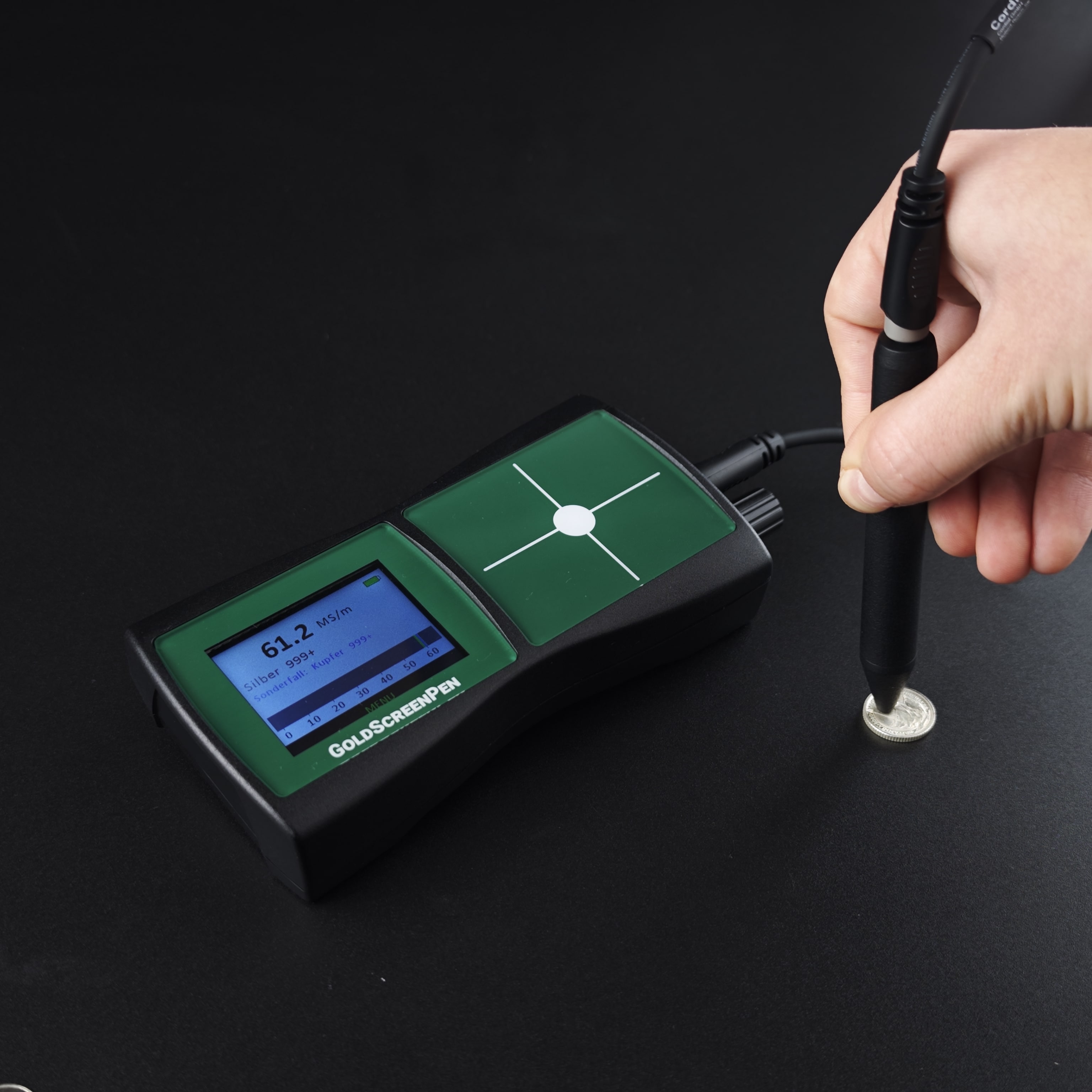 Tenga en cuenta que el GoldScreenPen solo mide la conductividad eléctrica. Las indicaciones sobre aleaciones son indicaciones automatizadas asignadas a determinados rangos de conductividad y no significan necesariamente que se trate de la aleación indicada. Siempre se deben utilizar otros métodos de prueba (como, por ejemplo, una determinación aproximada de la densidad) para realizar una clasificación correcta.